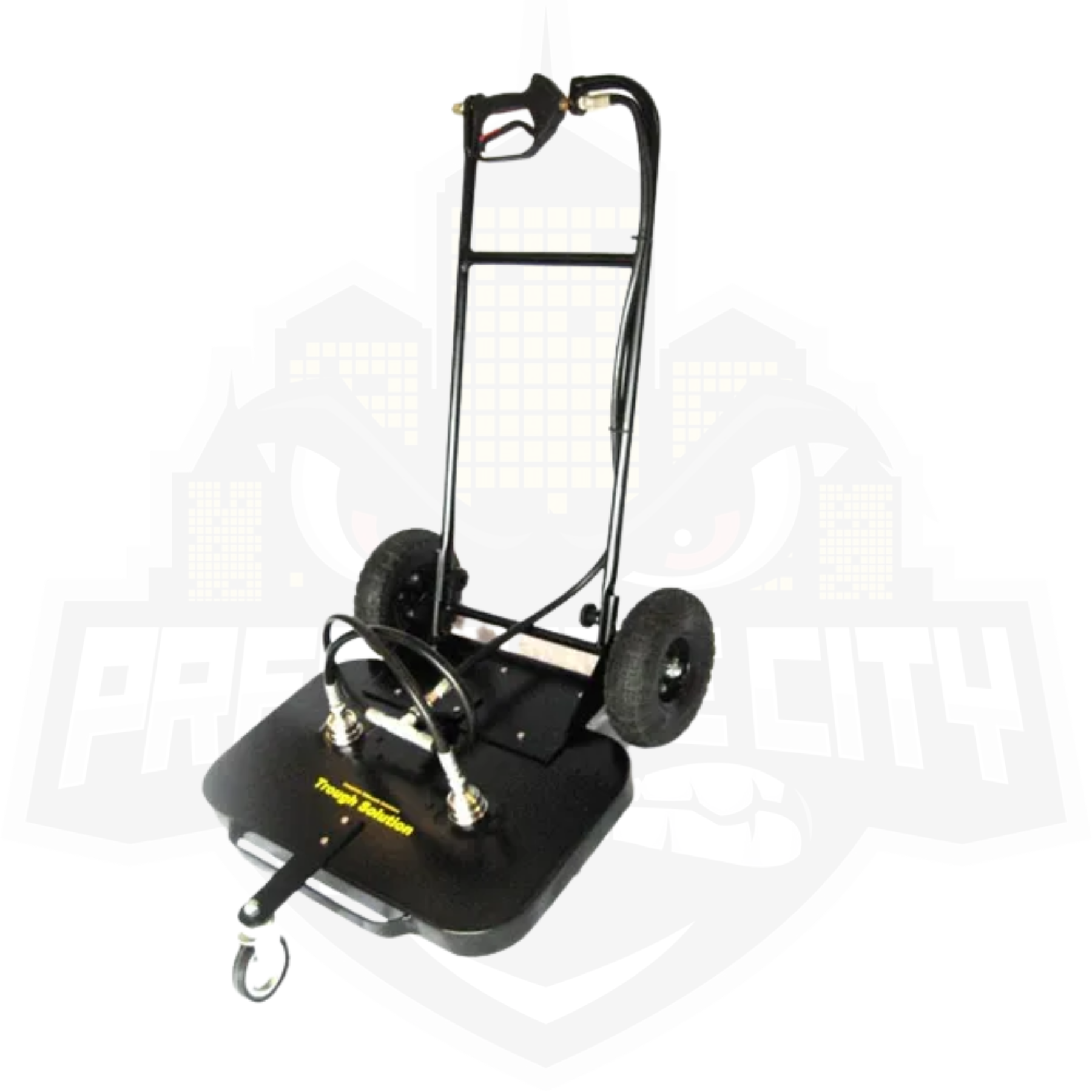 The Trough Solution's dual 12” rotor arms spin faster than a 20” bar so you can move faster. The angled rotor arms match the contour of the trough. Only one pass is required by a single operator. With an assistant moving the rig & hose it is a continuous movement down the road. If you are doing Community Cleaning, it is a must have piece of equipment!