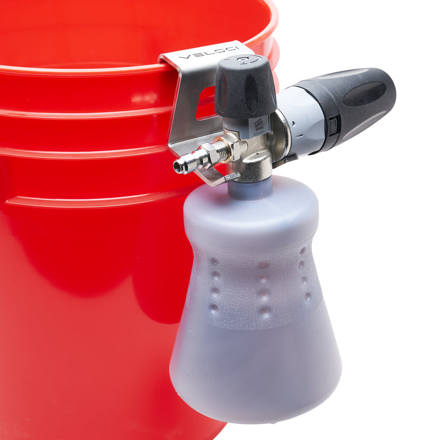 Got the bucket? Got the PF22 foam cannon and a spray gun – but don’t want to set the foam cannon on the ground? Use this handy bucket hanger when you’re not washing and turn your bucket into a caddie! Or, mount the bracket to the wall and use it for storage. But wait, there’s more! The Ventuno Bracket can hold more than a foam cannon, it can hold spray guns, lances, or any Veloci accessory you can think of – or even maybe your favorite ballcap. The coolest feature of the Ventuno is that this bracket is made up of two interlocking 12-gauge Italian stainless-steel pieces, allowing you to use it as a bucket hanger even when mounted to the wall. Simply lift the forked piece up and off the mounted piece and place on the corner of a bucket – and vice versa – It’s that easy! For temporary storage or while your hands are full, the PF22 foam cannon can hang securely on the bracket alone, or as a foam cannon and spray gun duo.